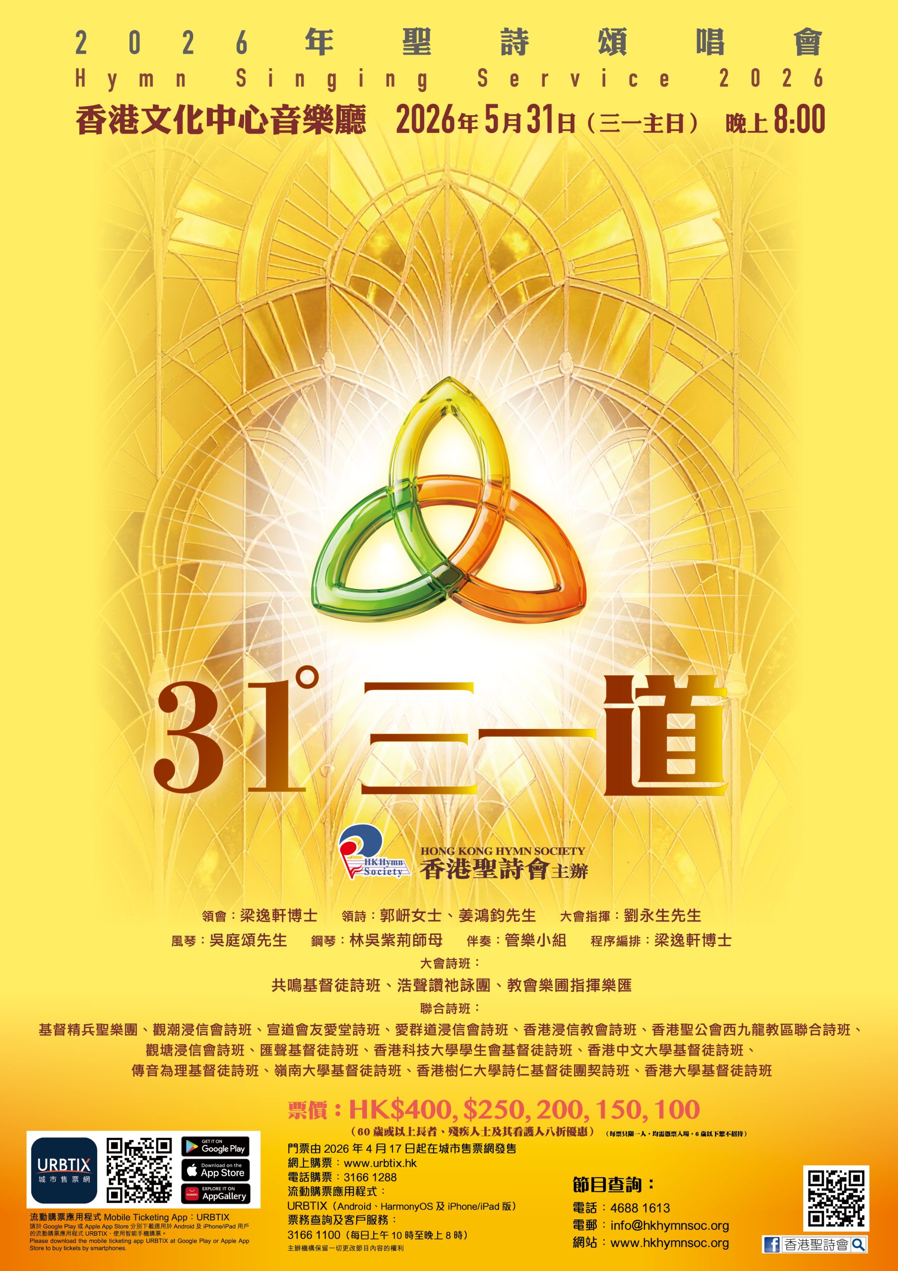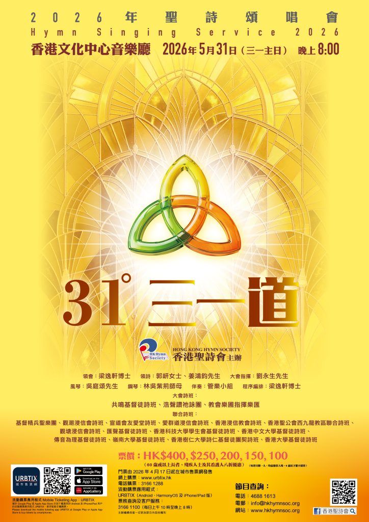 適逢聖三一主日,2026年聖詩頌唱會「三一道」將於 2026年5月31日 舉行!誠邀大家齊聚香港文化中心,與詩班和銅管樂隊一起,以詩歌讚美三位一體的上帝!